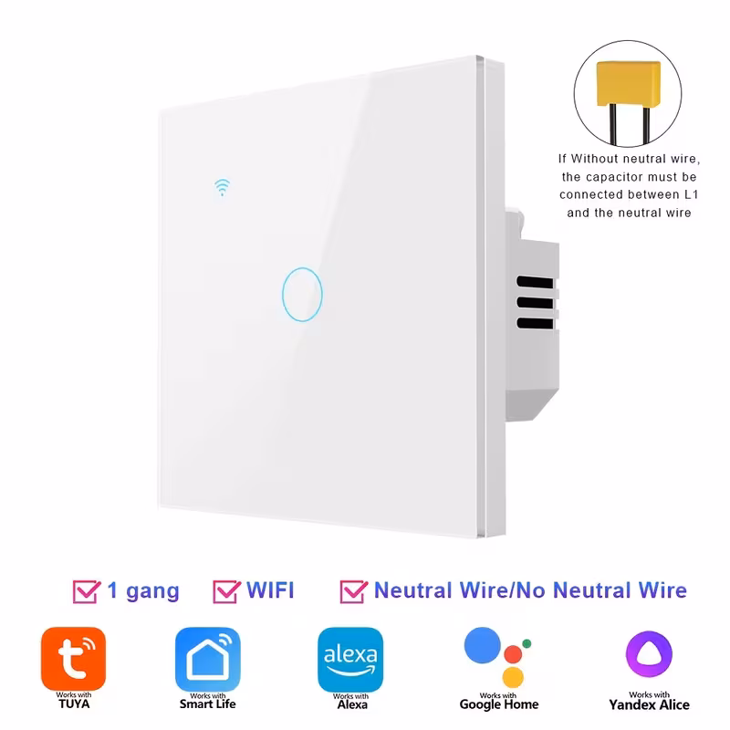 WIFI Smart Wall Light Switch Smart Home European Standard AC100-240V Neutral Wire Required/No Neutral Wire Required for Voice Control White/Black 1/ Gang Compatible with Alexa Google